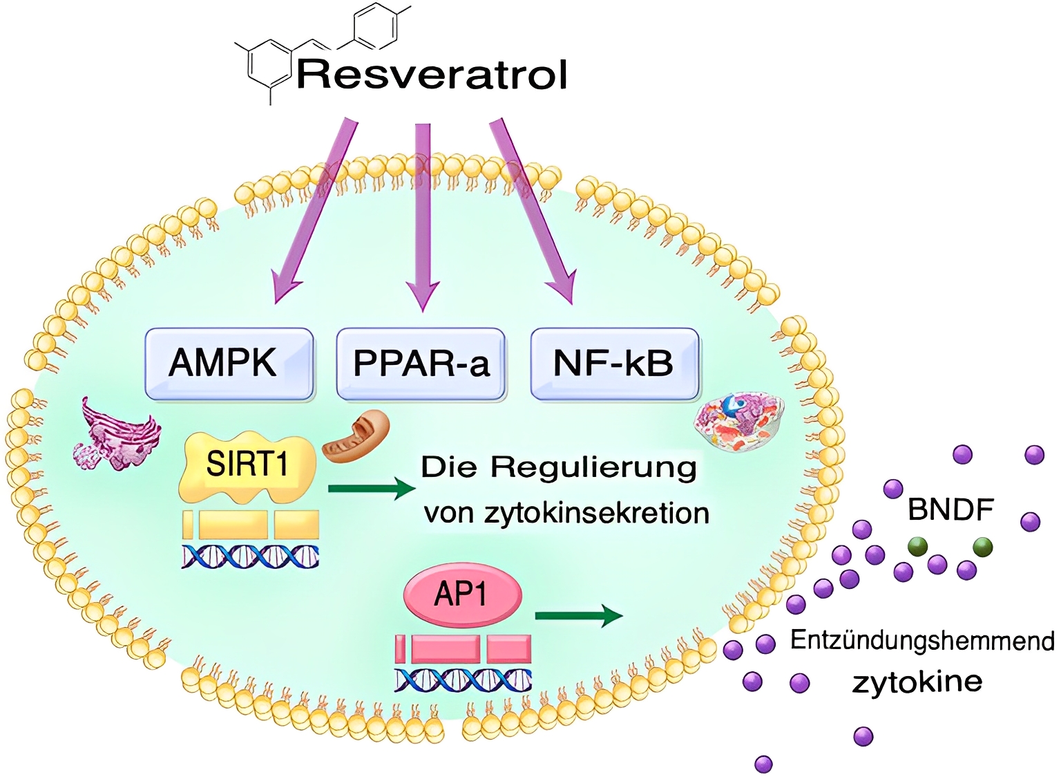 Auf zellulĂ€rer Ebene zeigt Resveratrol auch eine bemerkenswerte Wirkung auf die Sirtuine, eine Familie von NAD+-abhĂ€ngigen Enzymen, die eine SchlĂŒsselrolle bei der Zellalterung, DNA-Reparatur und Stresstoleranz spielen. Es wurde nachgewiesen, dass Resveratrol die AktivitĂ€t von Sirtuin 1 (SIRT1) stimuliert, was die Zellregeneration und den Schutz vor altersbedingten Erkrankungen fördert. Sirtuine sind in vielen biologischen Prozessen beteiligt, darunter EntzĂŒndungshemmung, Fettstoffwechsel und Genregulation. Durch die Aktivierung dieser Enzyme unterstĂŒtzt Resveratrol die Gesundheit des Genoms und verlĂ€ngert die Lebensdauer von Zellen. DarĂŒber hinaus wirkt Resveratrol durch die Aktivierung des AMP-aktivierten Proteinkinase (AMPK)-Signalsystems, das als ein „Molekularschalter“ fĂŒr den Energiehaushalt der Zellen fungiert. Diese Aktivierung fĂŒhrt zu einer Erhöhung der Zell-Energieproduktion, einer besseren Insulinempfindlichkeit und der Förderung des Fettstoffwechsels. Dieser Mechanismus hat positive Auswirkungen auf Gewichtsregulation, Fettabbau und die PrĂ€vention von metabolischen Erkrankungen wie Adipositas und Typ-2-Diabetes.
